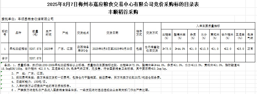 受客戶委托,梅州市嘉應(yīng)糧食交易中心有限公司定于2025年8月7日(星期四)舉辦糧食競(jìng)價(jià)交易會(huì)。豐順縣糧食收儲(chǔ)有限公司擬采購2025年產(chǎn)早秈稻谷5207.878噸。