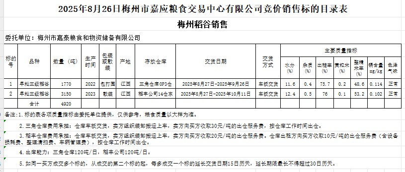 受客戶委托,梅州市嘉應糧食交易中心有限公司定于2025年8月26日(星期二)舉辦糧食競價交易會。梅州市嘉泰糧食和物資儲備有限公司擬銷售2022年、2023年產(chǎn)早秈稻谷4920噸。