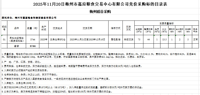 受客戶(hù)委托,梅州市嘉應(yīng)糧食交易中心有限公司定于2025年11月20日(星期四)舉辦糧食競(jìng)價(jià)交易會(huì)。梅州市嘉泰糧食和物資儲(chǔ)備有限公司擬采購(gòu)2025年產(chǎn)早秈稻谷3744噸。