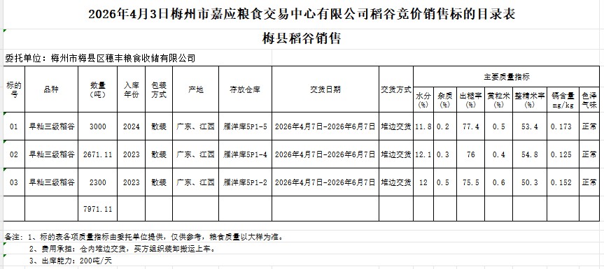 文件下載:2026年4月3日梅州市梅縣區(qū)穗豐糧食收儲有限公司稻谷銷售